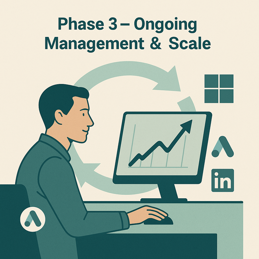 The Ongoing Management & Scale phase focuses on continuous improvement, long-term growth, and sustained performance across every part of your marketing ecosystem. Once your campaigns and systems are live, the WarmProspect team takes over full operational management—monitoring performance, optimizing campaigns, and refining automations to keep your digital infrastructure running at peak efficiency.